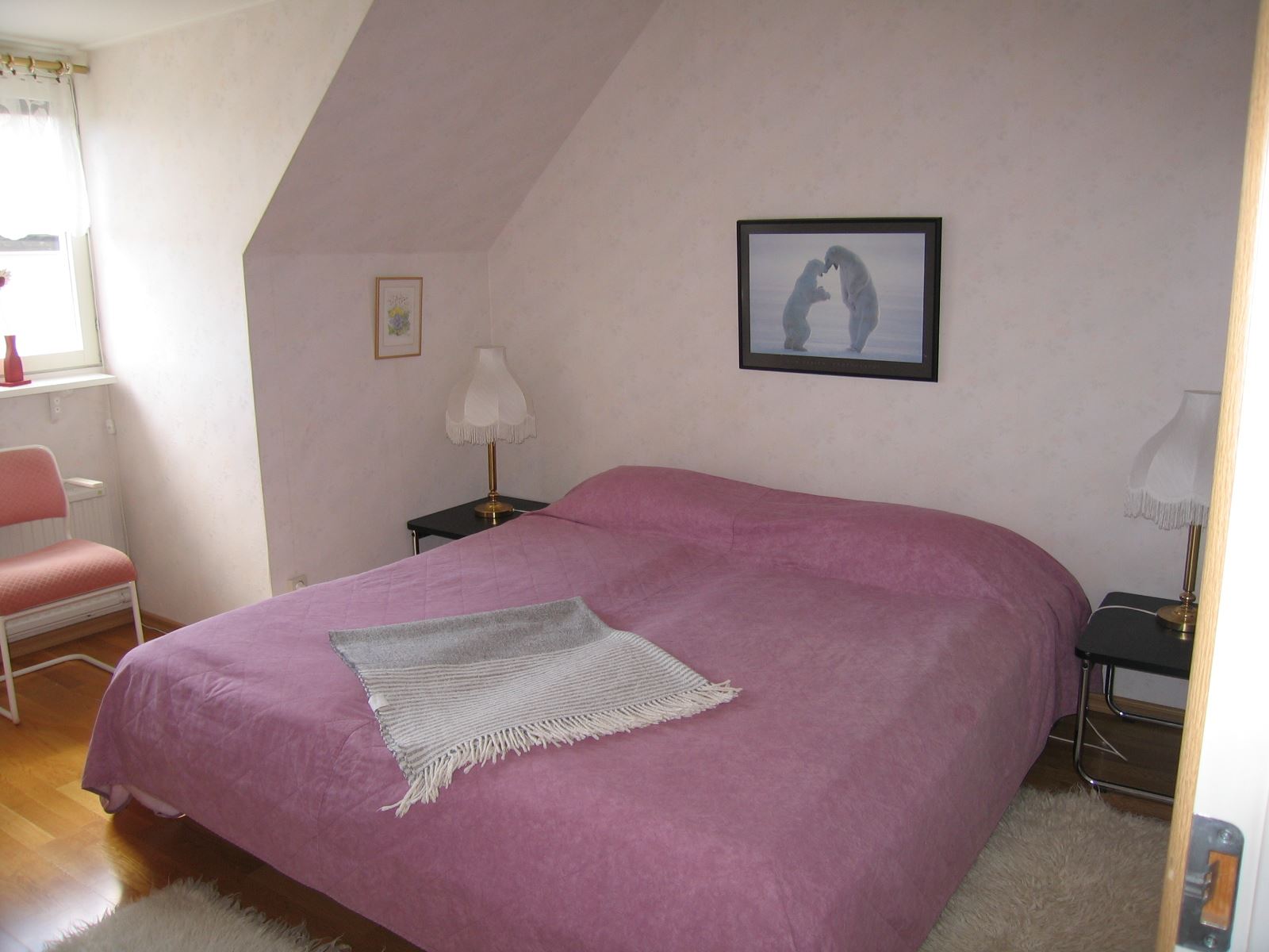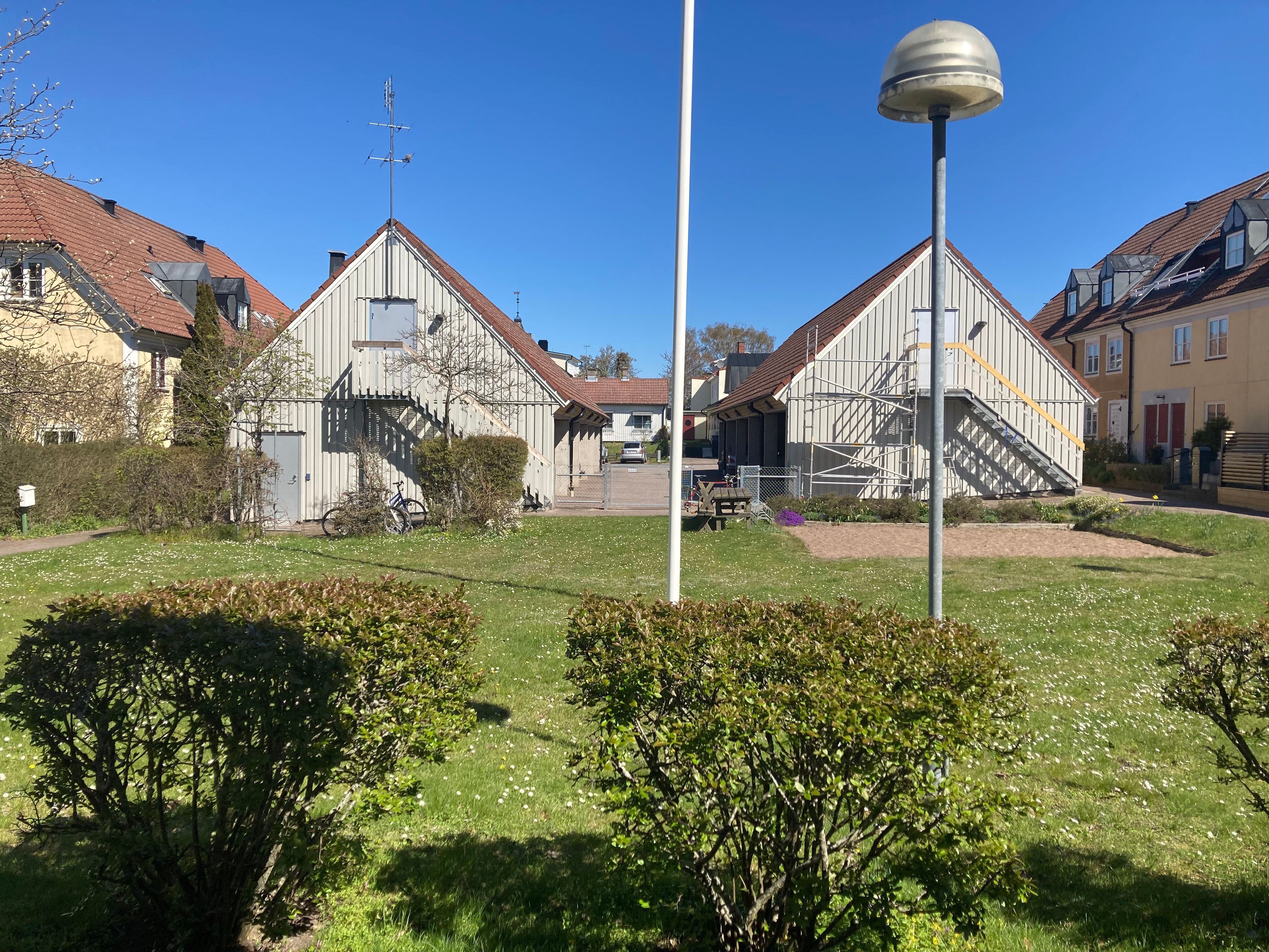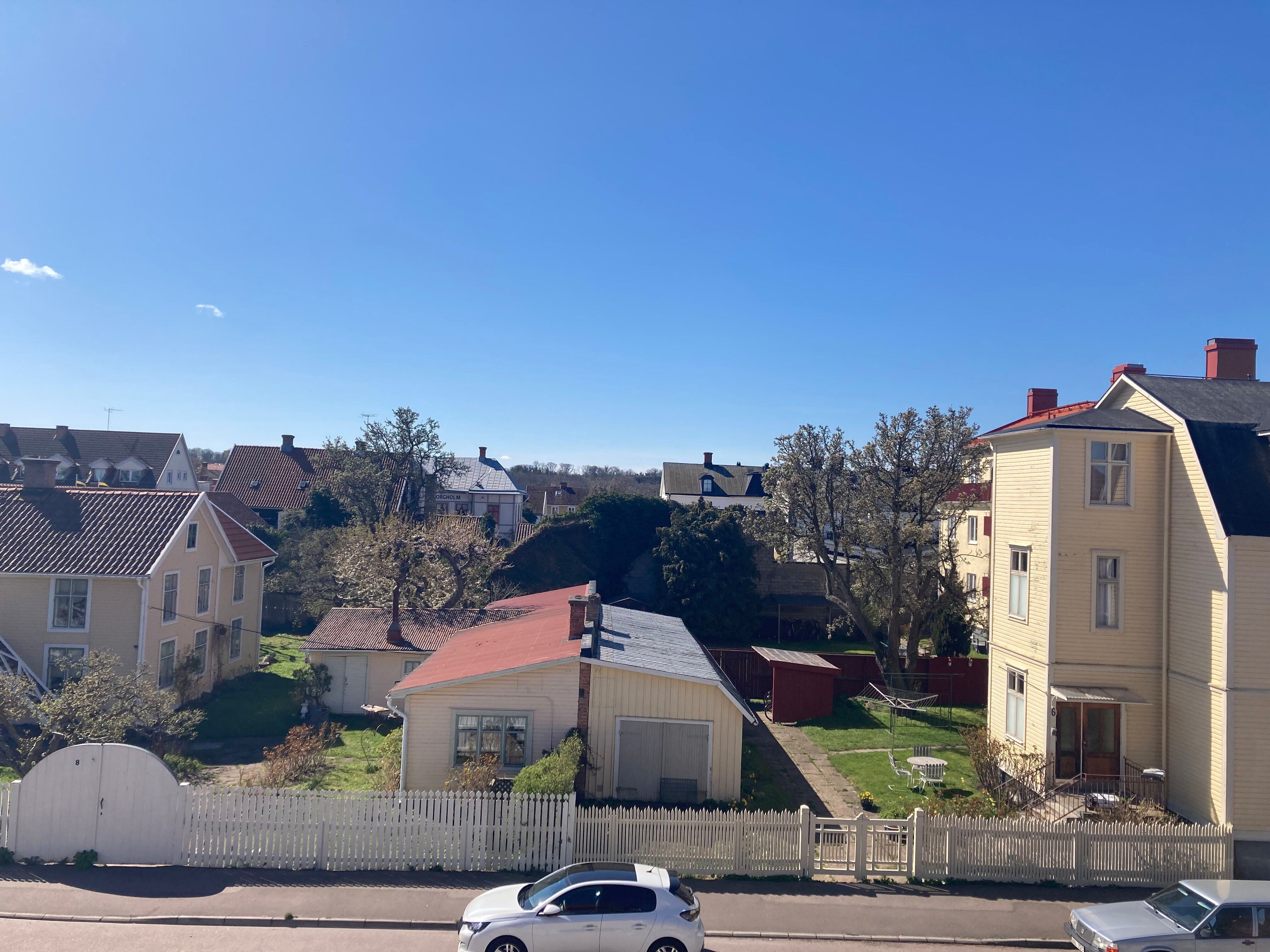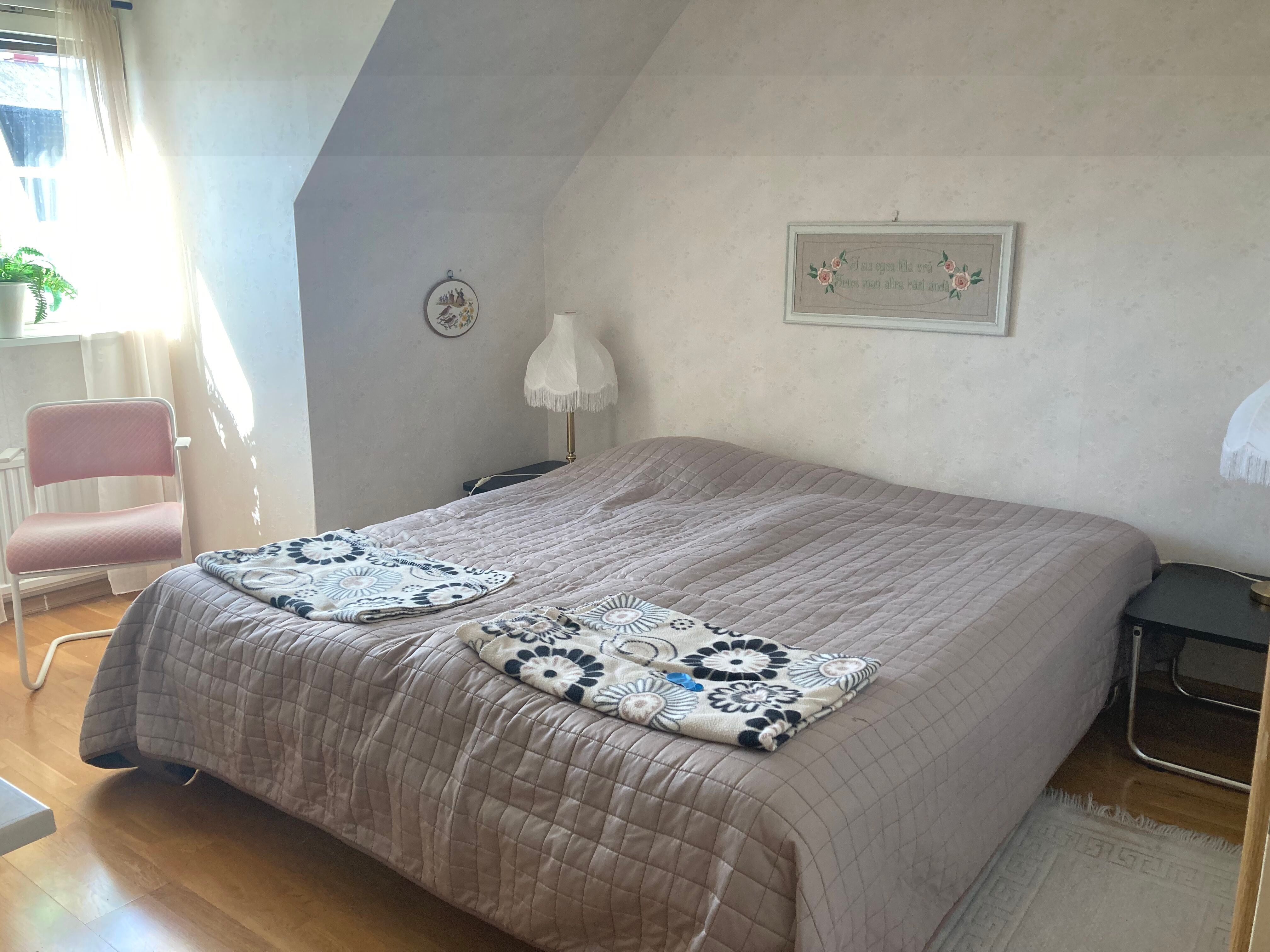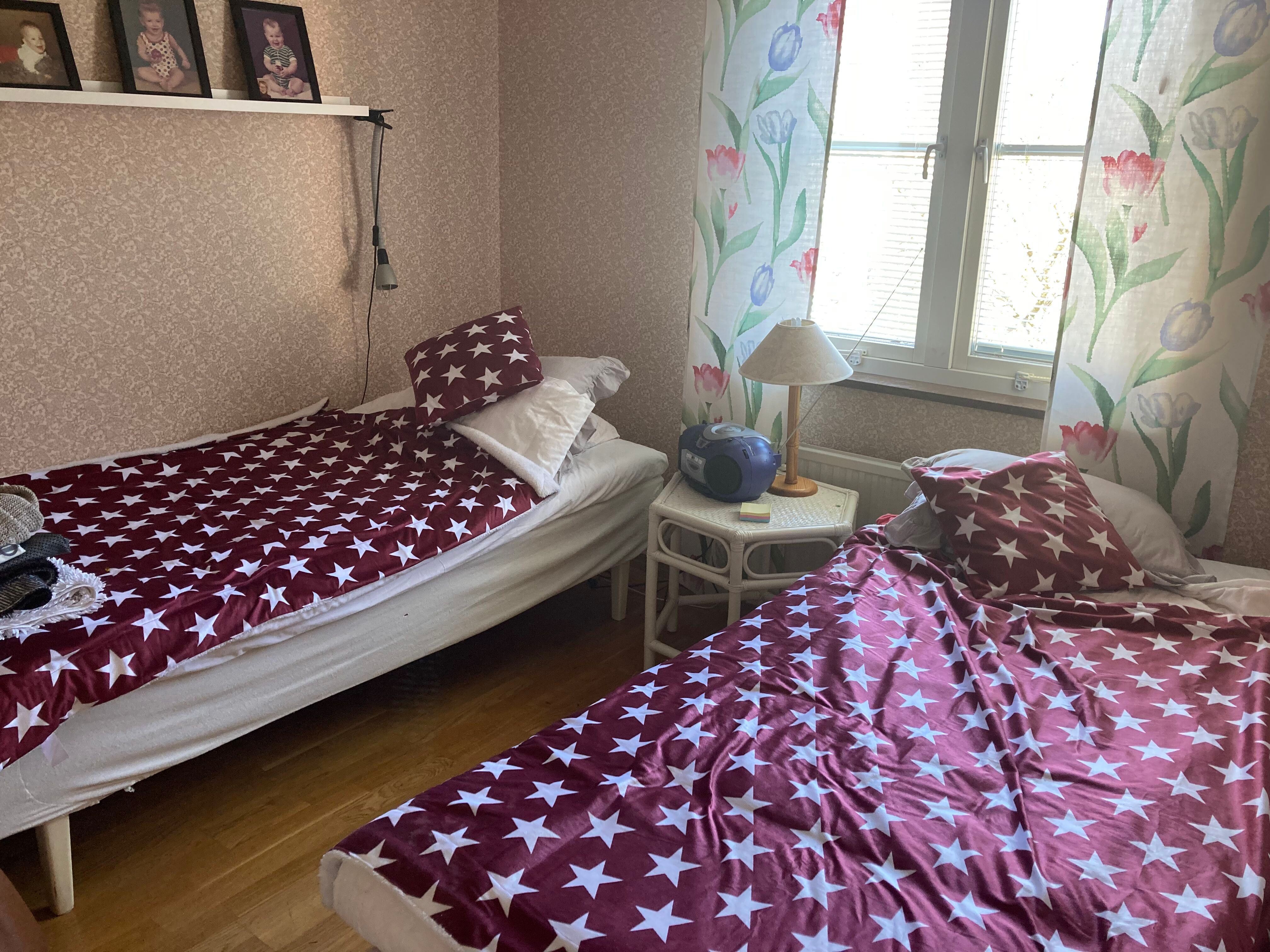 Apartment in 2 levels. 125m2, Steps up to plan 1, kitchen with stove, dishwasher, fridge, freezer and coffee maker, living room with sofa and TV. 1 bedroom with 2 beds (spring-mattress), shower and WC, washing machine and drying cabinet. Level 2, furnished hall. 2 bedrooms with 1 double bed, elastic, in each room. Shower and WC. Balcony with outdoor furniture. Pets are not allowed. Smoking indoors is not allowed. Location: Borgholm Bad: Sjöstugan