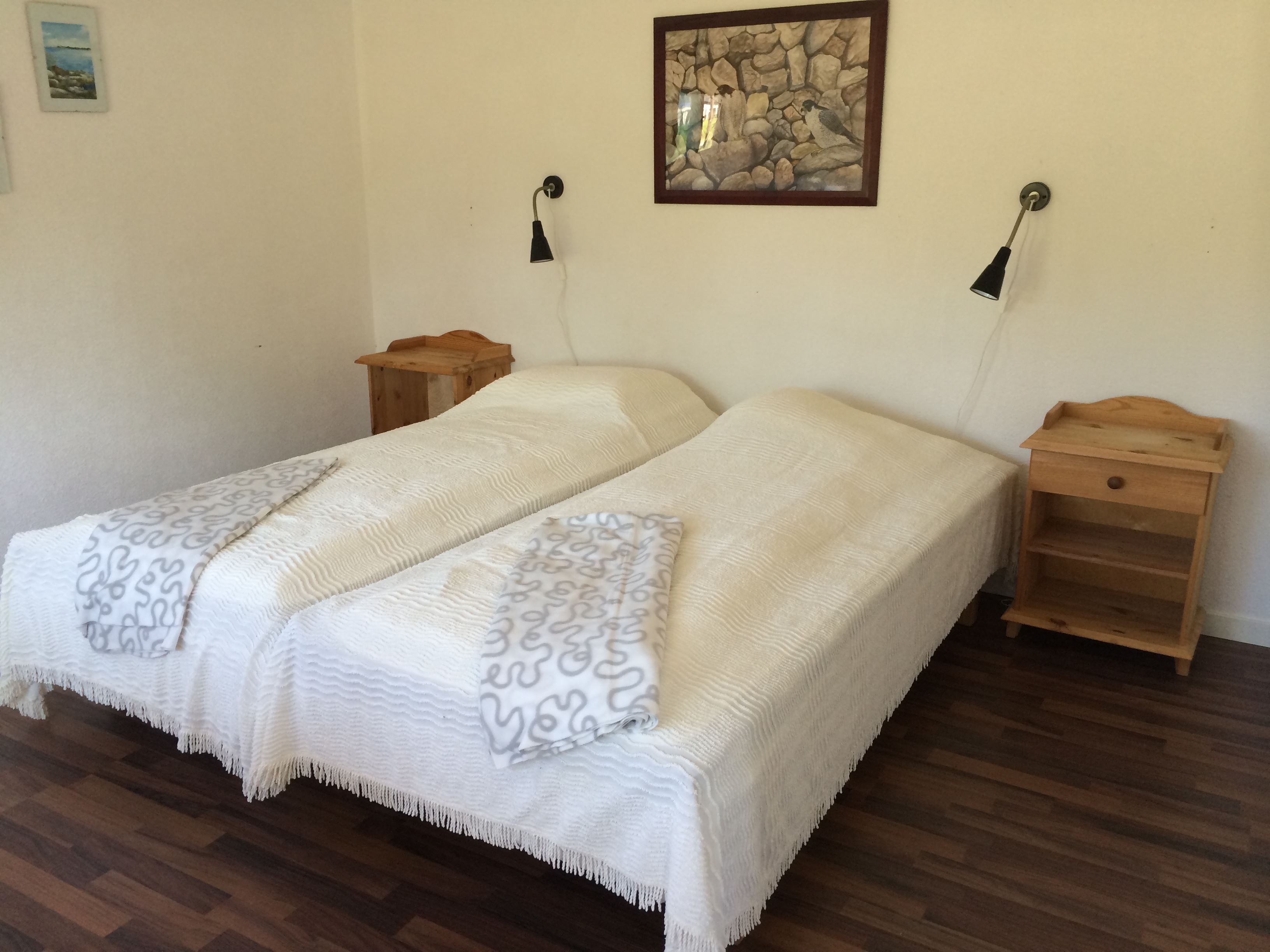 100 bäddar fördelade på gäststugor samt annex.Rum och stugor har dusch/WC. Inkl frukost. Linne kan hyras.Pool, bastu, tennisbana, båtar, kanoter,