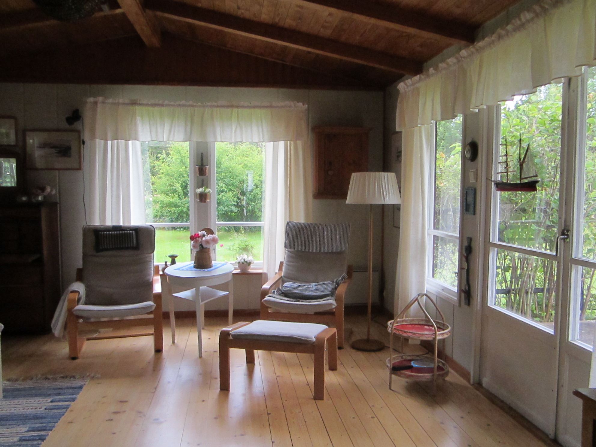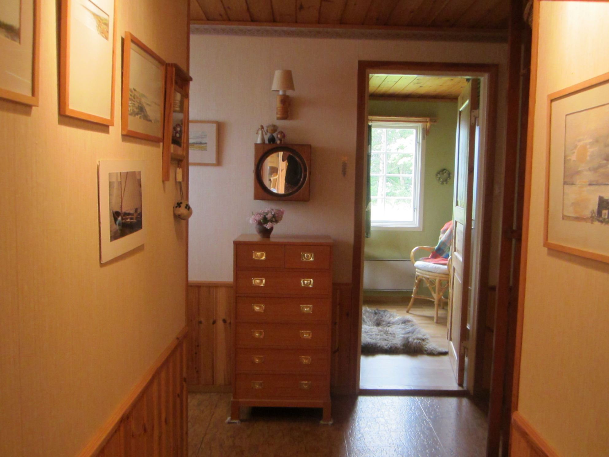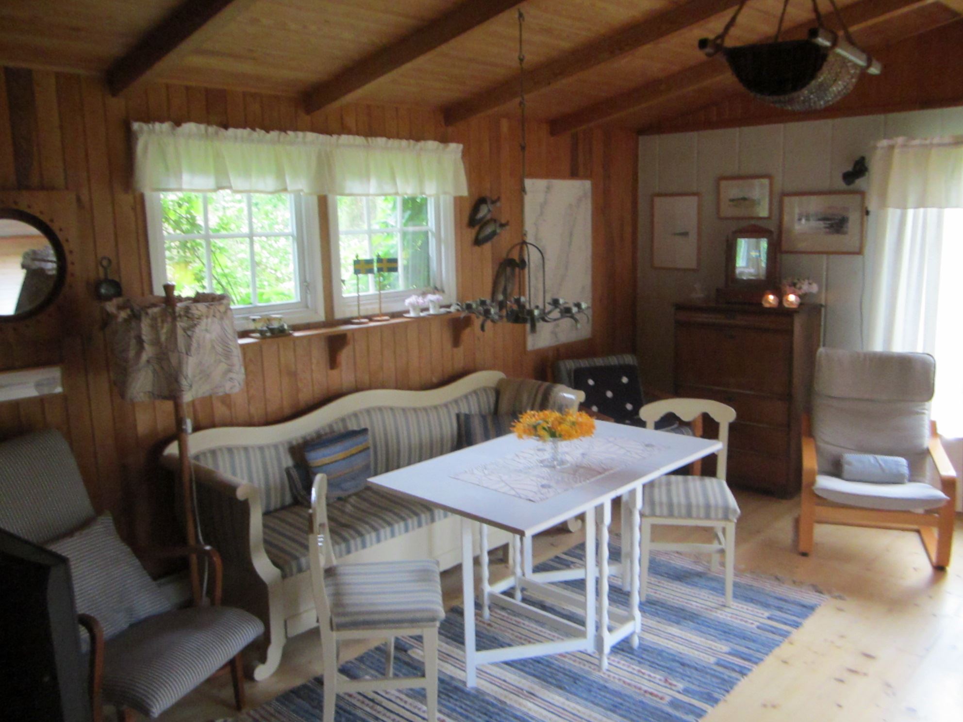 Huset har fyra rum och kök. Köket är fullt utrustat: Kyl och frys, elspis med häll, mikro, kaffebryggare och vattenkokare. I anslutning till köket separat matrum. Två sovrum med vardera en våningssäng samt ett sovrum med två enkelsängar. Sängarna har skumgummimadrasser. Vardagsrum med TV (basutbud). Ett rum med WC och tvättfat, separat duschrum. Uppvärmning via elradiatorer. Altan, delvis under tak mot sjösidan. Egen tomt. Grill. Vid ankomst hittar ni en grå pärm med information om stugan, sophantering mm.