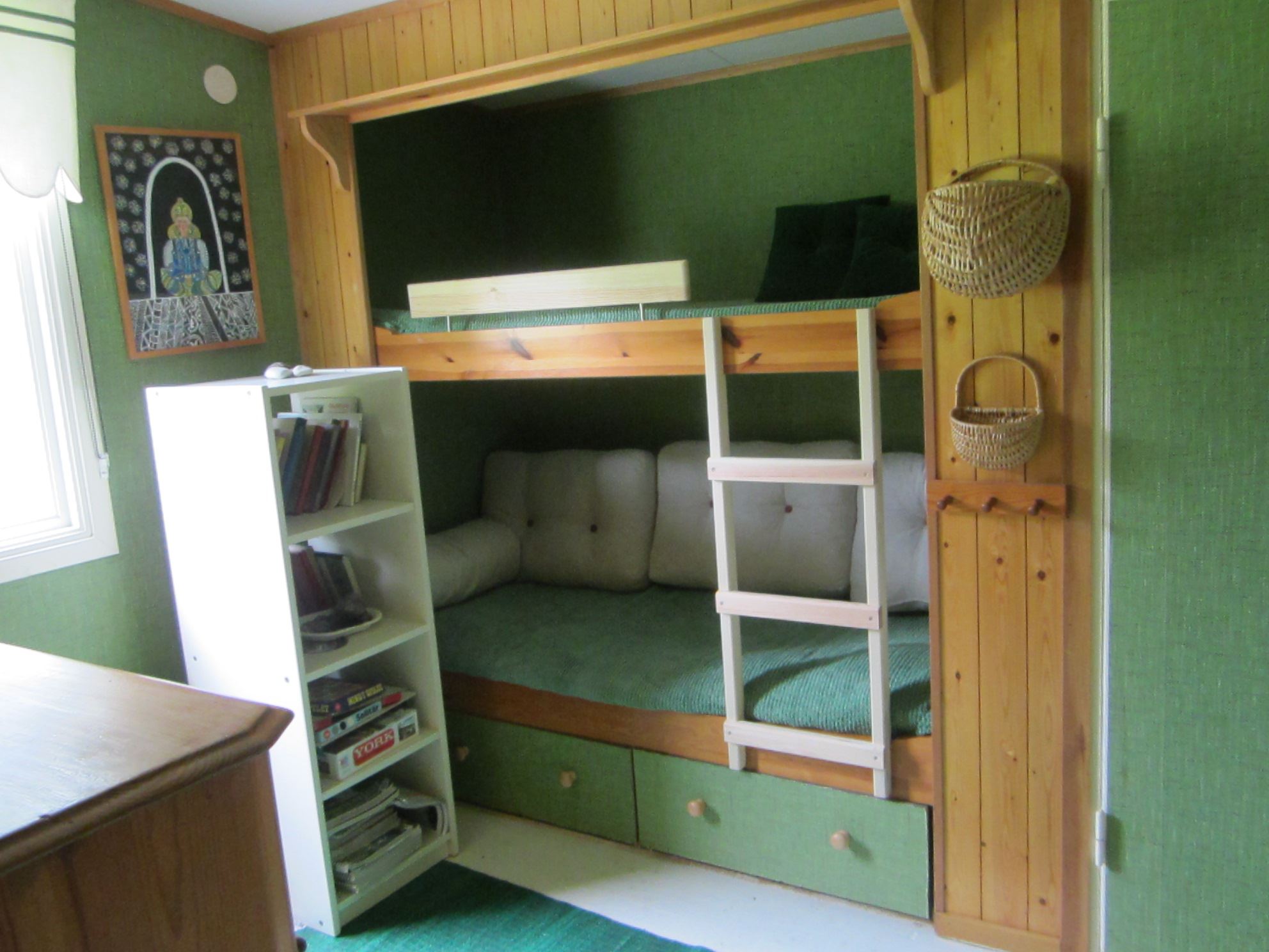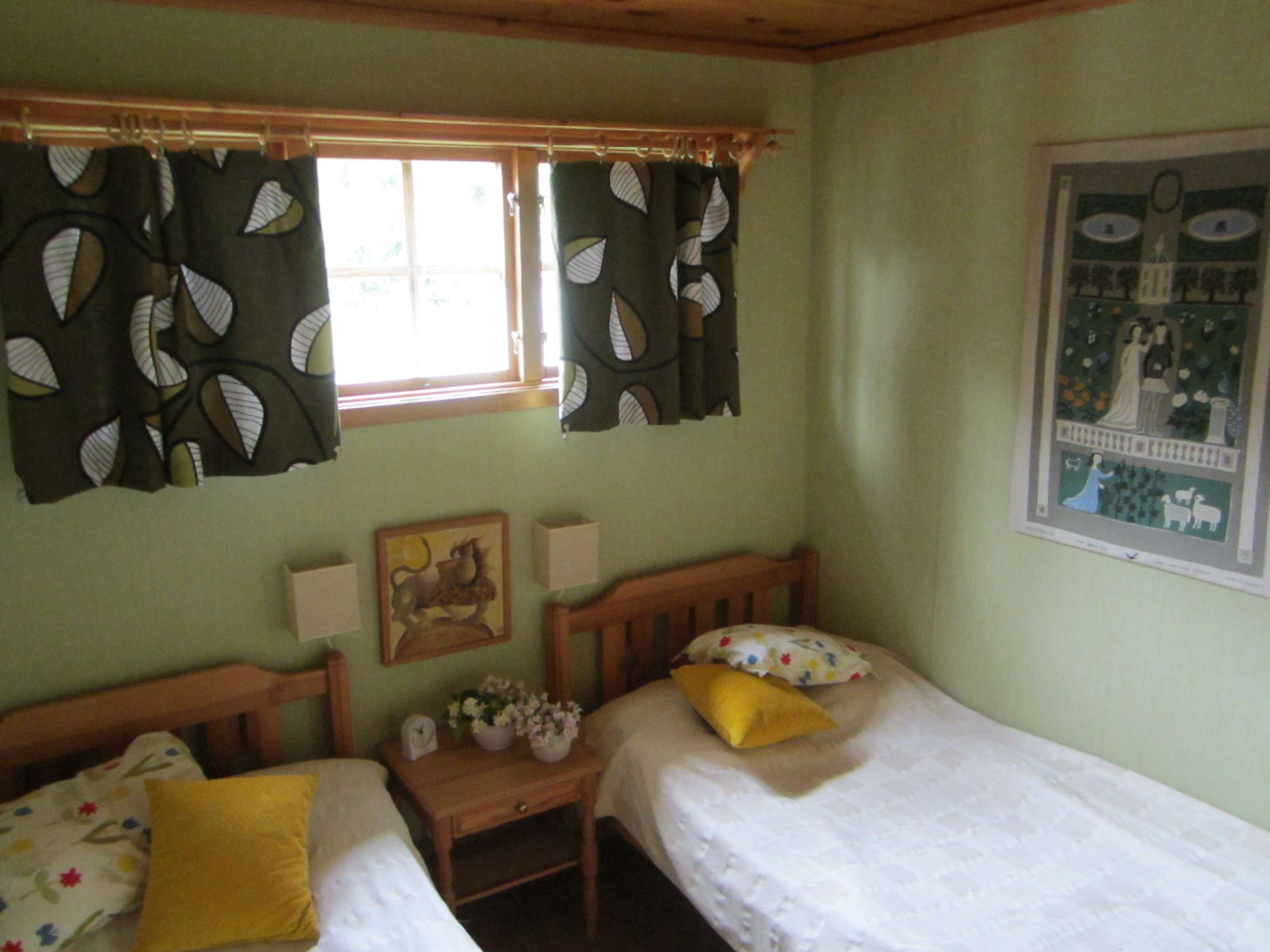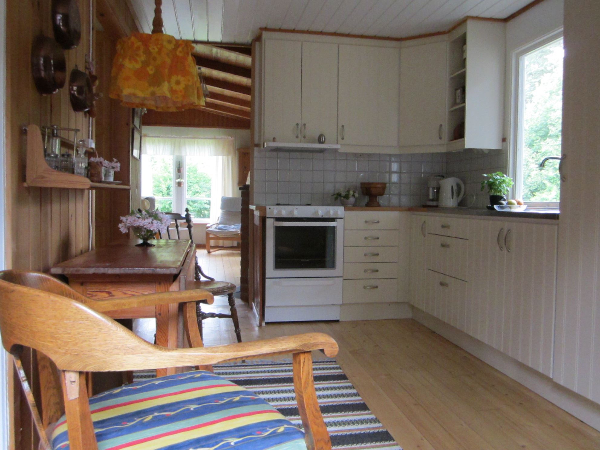 Huset har fyra rum och kök. Köket är fullt utrustat: Kyl och frys, elspis med häll, mikro, kaffebryggare och vattenkokare. I anslutning till köket separat matrum. Två sovrum med vardera en våningssäng samt ett sovrum med två enkelsängar. Sängarna har skumgummimadrasser. Vardagsrum med TV (basutbud). Ett rum med WC och tvättfat, separat duschrum. Uppvärmning via elradiatorer. Altan, delvis under tak mot sjösidan. Egen tomt. Grill. Vid ankomst hittar ni en grå pärm med information om stugan, sophantering mm.