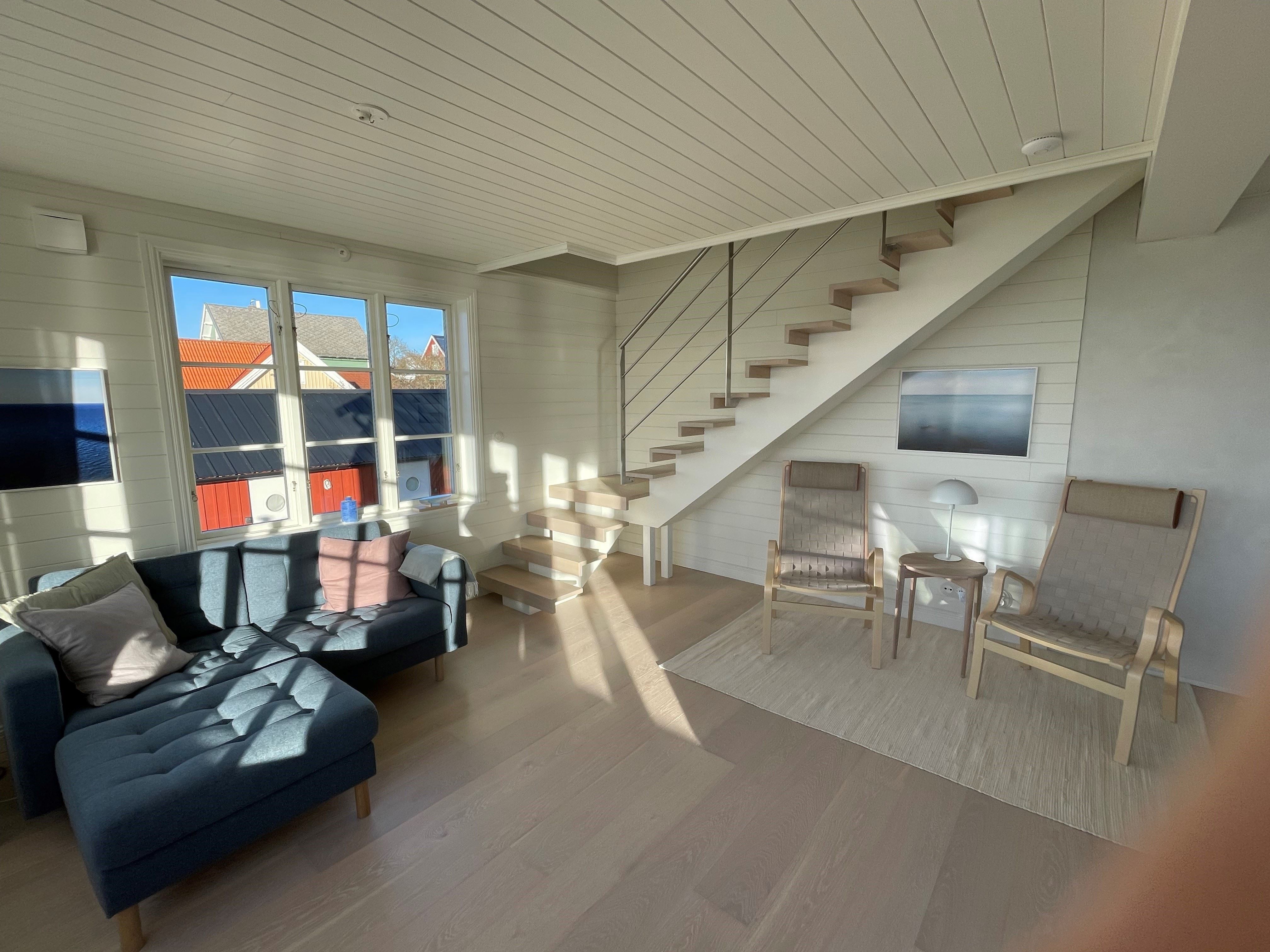 Lägenheten är 100m² i två plan med utsikt över havet. På nedre plan finns ett stort, ljust vardagsrum och balkong mot hamnen och havet. Ett fullt utrustat modernt kök med hällspis, micro, ugn, kyl/frys och diskmaskin. På nedre plan finns ett sovrum med dubbelsäng, samt badrum med golvvärme, dusch, toalett, samt tvättmaskin och tumlare.