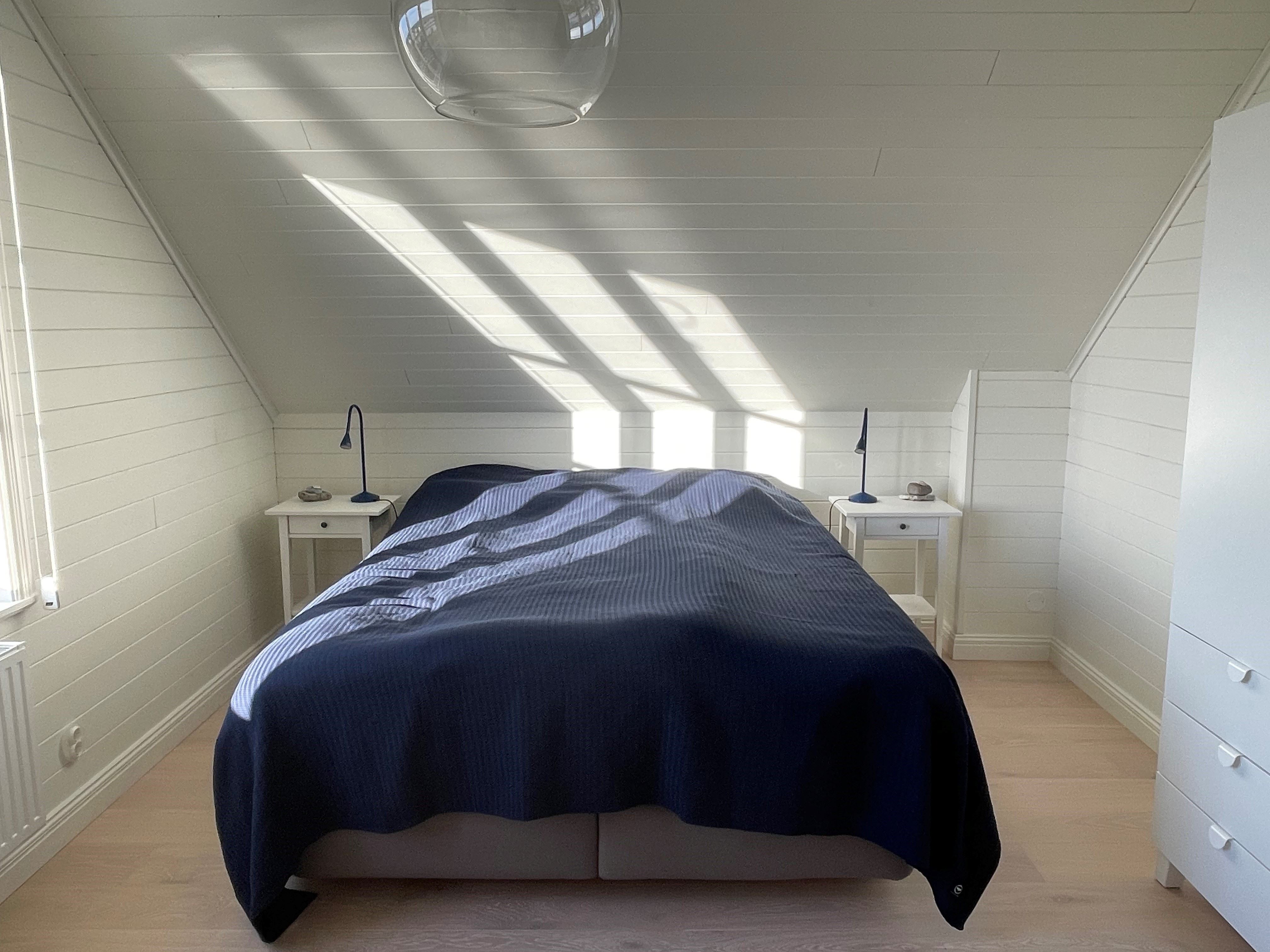 På övervåningen finns två sovrum med dubbelsängar och hall med bäddsoffa 140 cm x 200 cm (bäddsoffan ger möjlighet till extrabäddar mot kostnad), tv och badrum, även där golvvärme.