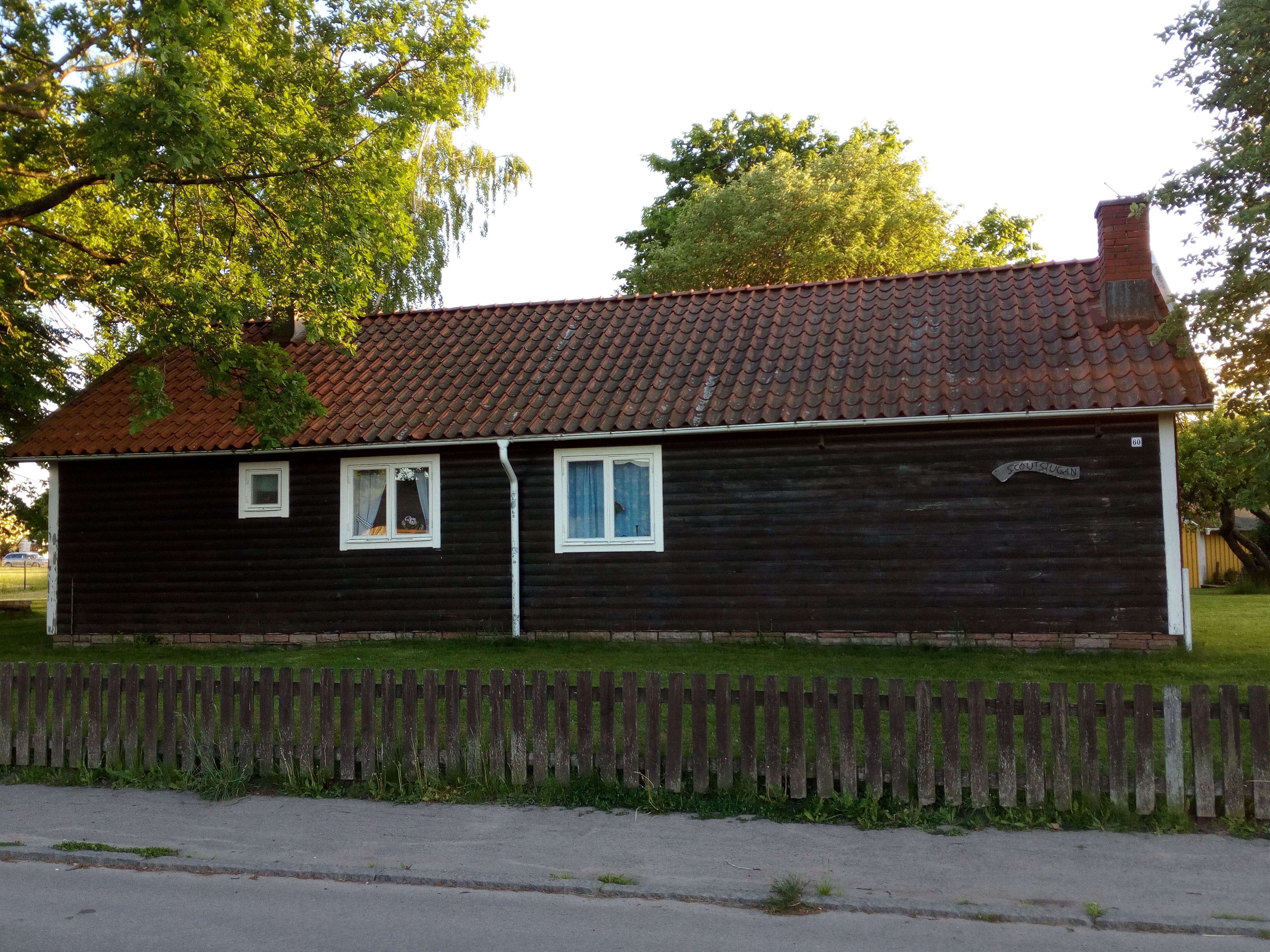 Stugan: 60 m². Scoutstuga. Ett stort rum med 5 ordinarie bäddar + 2 extrabäddar. Där finns 2 bäddsoffor (3 ordinarie bäddar), 2 enkelsängar tillsammans + 2 extrabäddar mot kostnad (varav 1 bädd i bäddsoffa + en bädd med skumgummimadrass). Pentry, varmt och kallt vatten. micro. WC. Ej dusch hänvisar till Borgholms badhus eller dusch i hamnen. På tomten finns en allmän lekplats. TV. Varmvattenberedare 30 liter. Husdjur får ej medföras. Ingen rökning inomhus.