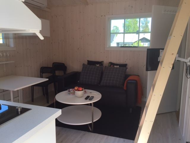 och köksbord. Sittmöbel, TV. 1 sovrum med 1 våningssäng med bredare nedre del. Stege upp till loft med 2 låga resårbäddar. Internet . Grill