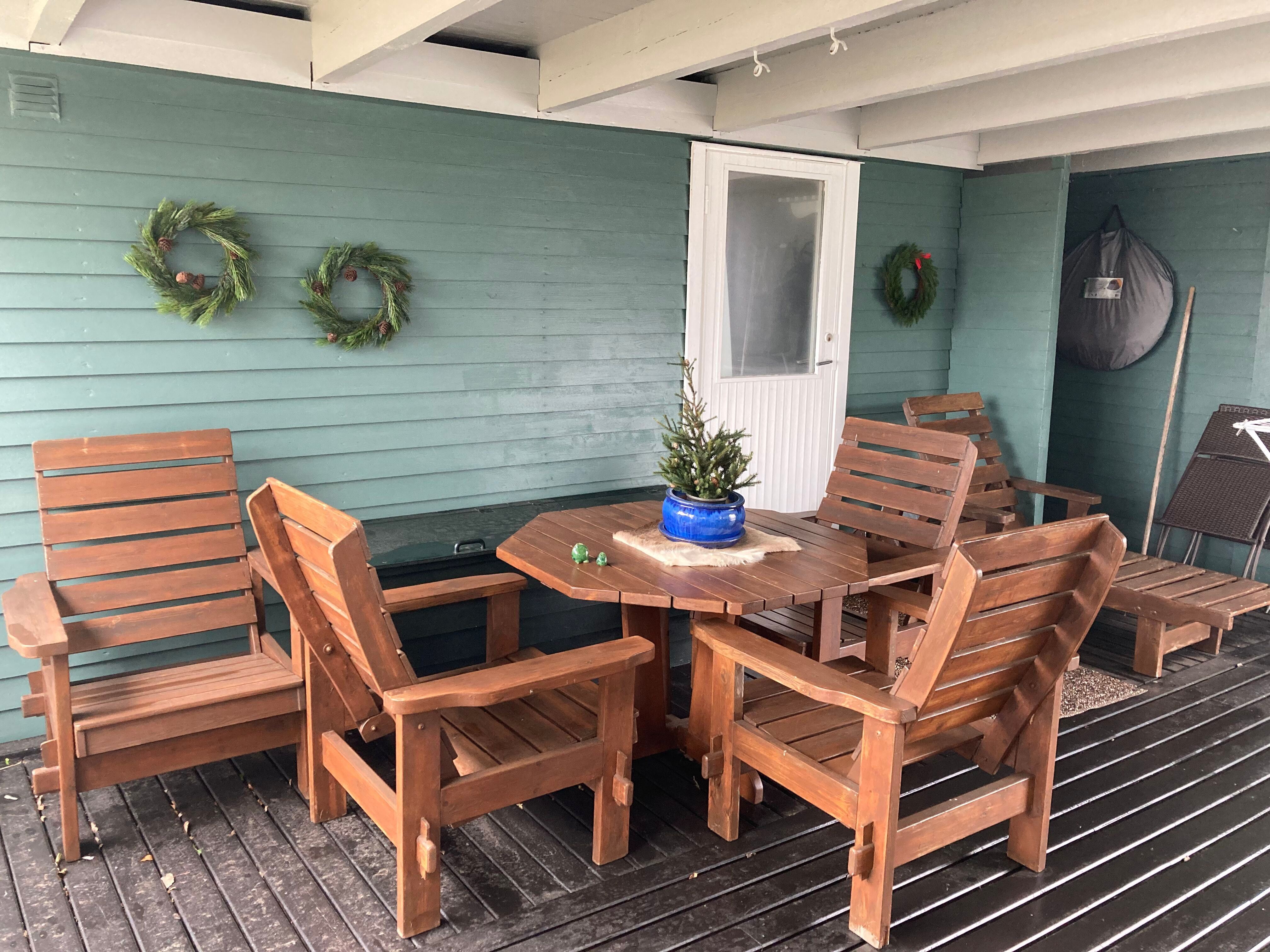 Stuga 95 m² med ihopbyggt extra rum för två personer. Kök med spis/ugn, kyl, frys, diskmaskin, micro och kaffebryggare. TV finns i köket. (30 kanaler). Vardagsrum med soffgrupp. Ett sovrum med en säng 120 cm bred, Ett sovrum/ingångsrum med en säng 90x200 cm, rum som är ihopbyggt med stugan där det finns två sängar som är vardera 80 cm breda ihopsatta. Det finns även en ihopfällbar säng som är extrabädd om man ev är 5 personer(extra kostnad). Badrum med dusch/WC, tvättmaskin. Luftvärmepump, golvvärme. Pool och inglasad altan 15m. Mellan stugan och det ihopbyggda rummet finns även utemöbler under tak. Wifi finns. Egen tomt på 1380m2