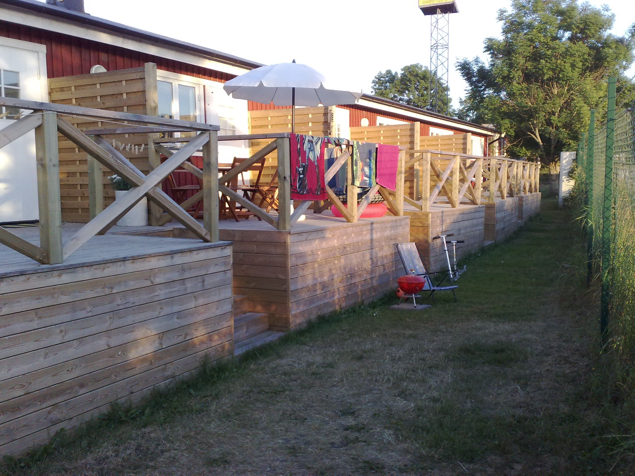 Lägenheter i äldre röda enplanslängor med egen ingång och terrass till varje lägenhet.