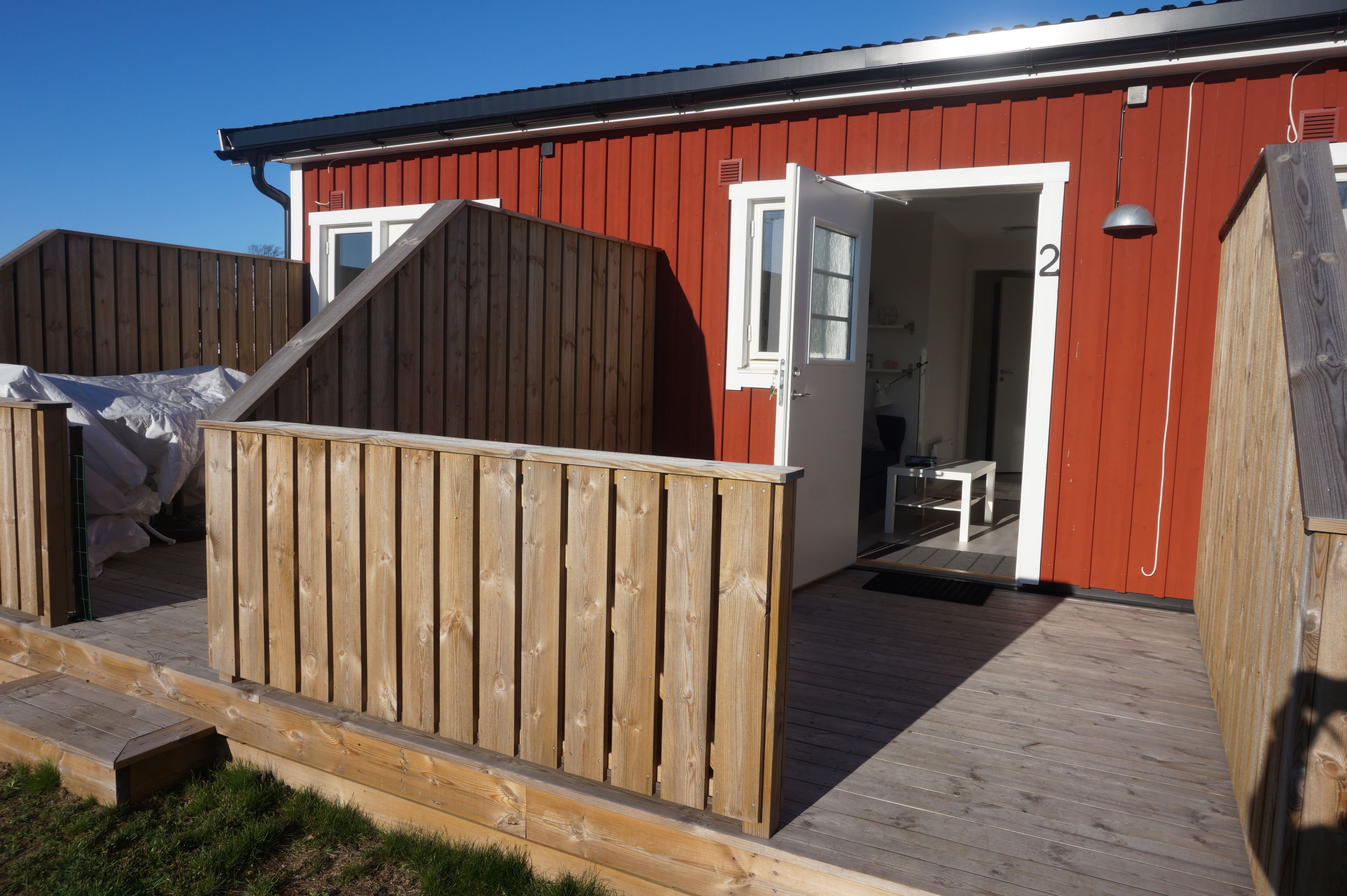 Egen uteplats och ingång. Parkeringsplats till varje lägenhet. med gångavstånd till barnvänlig strand.