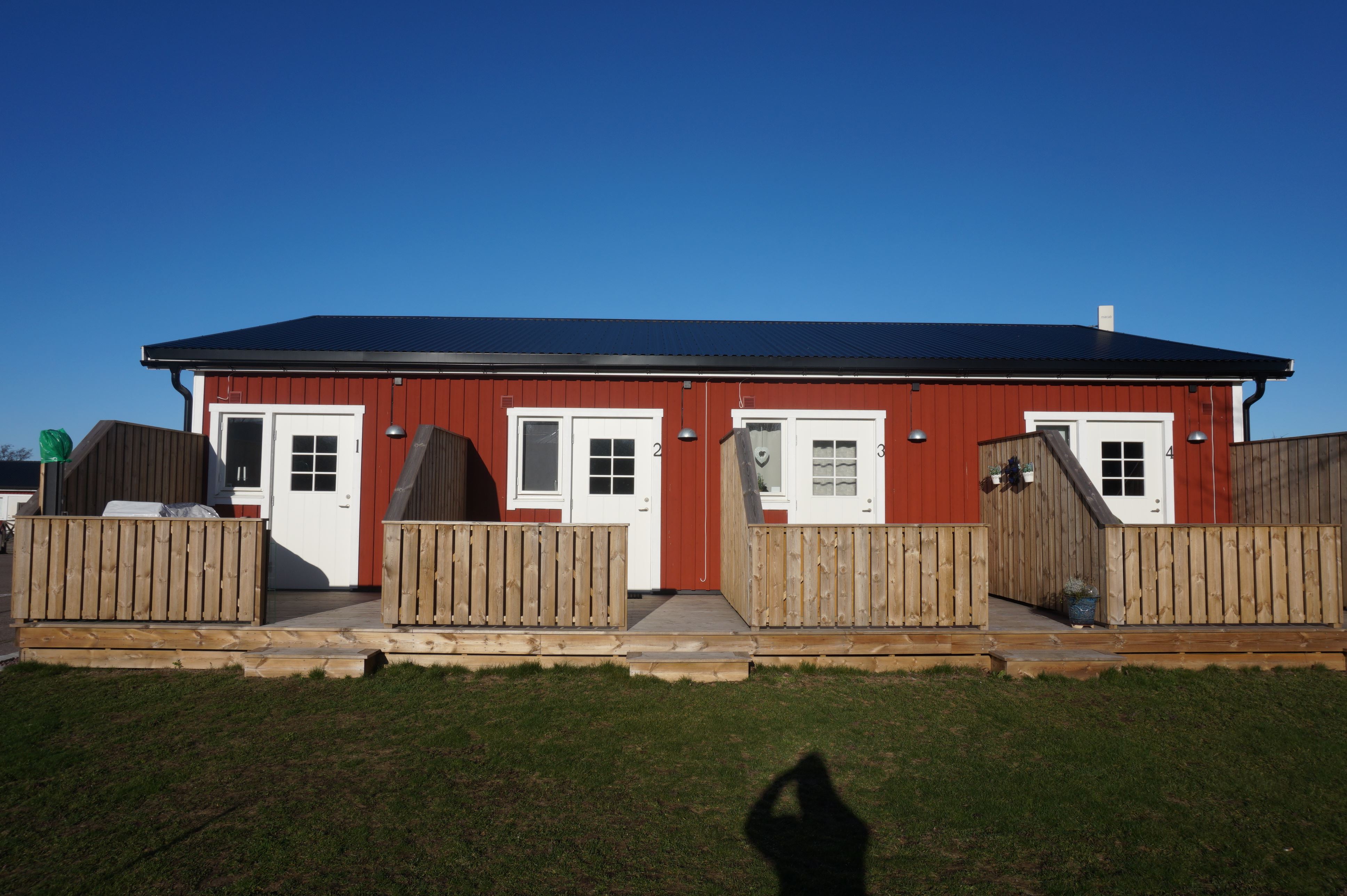 Lägenheter i röda enplanslängor.